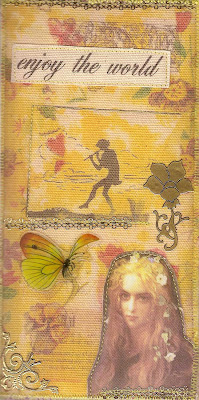 On the reverse page I also used a fabric-paper collage but this time one that I had scanned in to my computer and that I printed out on canvas. I stitched around the major outlines and added a fabric image in the bottom right corner. It came from Alpha Stamps Ophelia#2. The text came from the same source as the text on the other side and it was stitched on. Again I added self-adhesive embellishments including a transparent butterfly as shown.